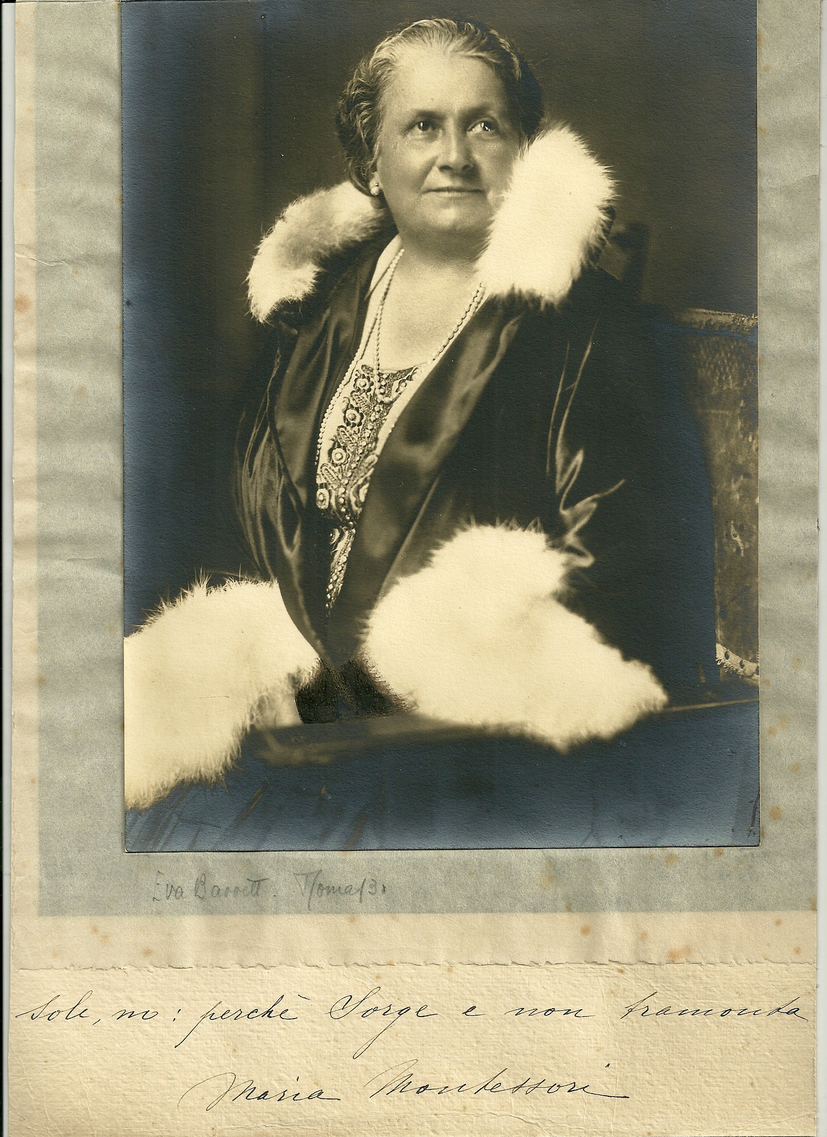 [Photograph of Maria Montessori with a dedication to Giuliana Sorge, her pupil since 1924 and later a trusted collaborator in many initiatives such as the direction of the Royal Montessori Method School, established in Rome in 1928. The dedication reads: “Sun, no: because Sorge (‘rise’) and does not set.” The photograph was taken in Rome in 1931 by the Englishwoman Eva Barrett] – F. Sorge, Giuliana Sorge: una vita con Maria Montessori. Memorie di famiglia, in Vita dell’infanzia, vol. LXX, no. 5-6/7-8, May-June/July-August 2021, p. 37.